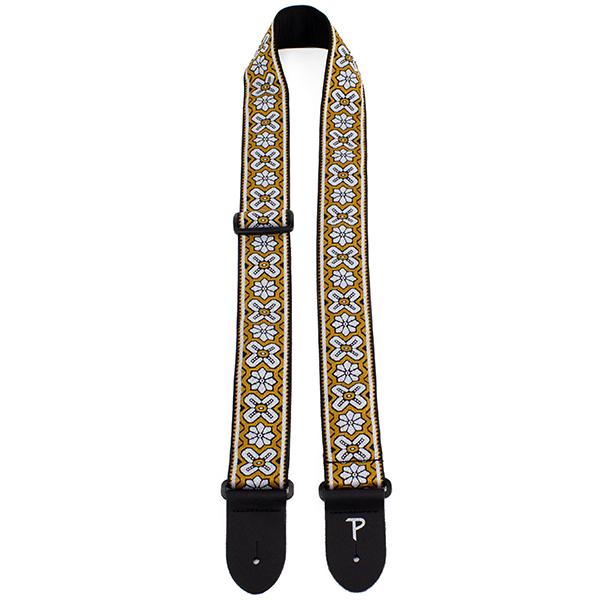 PERRI’S Leathers – 2″ YELLOW BLACK WITH FLOWERS/CROSSES GUITAR STRAP WITH LEATHER ENDS